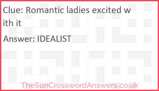 Romantic ladies excited with it is a crossword clue for which we have 1 possible answer and we have spotted 3 times in our database. This crossword clue was last seen on 20 July 2024 in The Sun Cryptic Crossword puzzle!