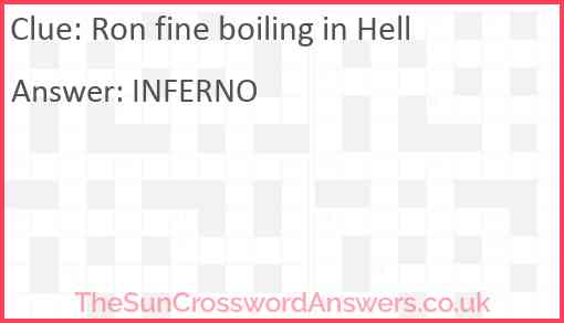 Ron fine boiling in Hell is a crossword clue for which we have 1 possible answer and we have spotted 1 times in our database. This crossword clue was last seen on 14 April 2021 in The Sun Cryptic Crossword puzzle!
