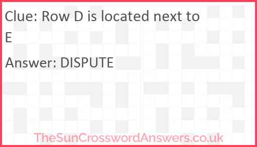 Row D is located next to E is a crossword clue for which we have 1 possible answer and we have spotted 1 times in our database. This crossword clue was last seen on 22 December 2020 in The Sun Cryptic Crossword puzzle!