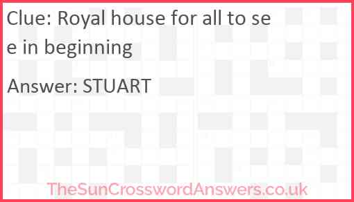 Royal house for all to see in beginning is a crossword clue for which we have 1 possible answer and we have spotted 1 times in our database. This crossword clue was last seen on 10 June 2022 in The Sun Cryptic Crossword puzzle!