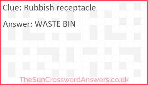 Rubbish receptacle is a crossword clue for which we have 3 possible answer and we have spotted 3 times in our database. This crossword clue was last seen on 26 April 2023 in The Sun Coffee Time Crossword puzzle!