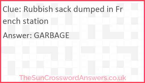 Rubbish sack dumped in French station is a crossword clue for which we have 1 possible answer and we have spotted 1 times in our database. This crossword clue was last seen on 12 January 2025 in The Sun Cryptic Crossword puzzle!