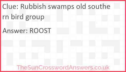 Rubbish swamps old southern bird group is a crossword clue for which we have 1 possible answer and we have spotted 4 times in our database. This crossword clue was last seen on 20 August 2023 in The Sun Cryptic Crossword puzzle!