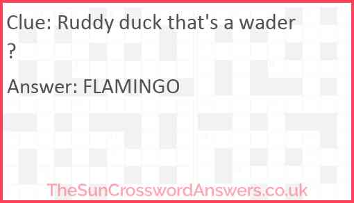 Ruddy duck that's a wader? is a crossword clue for which we have 1 possible answer and we have spotted 1 times in our database. This crossword clue was last seen on 15 March 2025 in The Sun Cryptic Crossword puzzle!