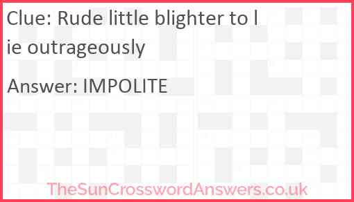 Rude little blighter to lie outrageously is a crossword clue for which we have 1 possible answer and we have spotted 4 times in our database. This crossword clue was last seen on 18 June 2023 in The Sun Cryptic Crossword puzzle!