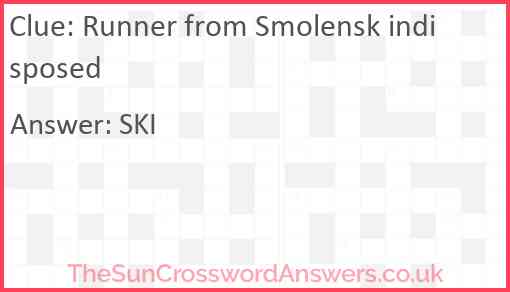 Runner from Smolensk indisposed is a crossword clue for which we have 1 possible answer and we have spotted 3 times in our database. This crossword clue was last seen on 13 April 2023 in The Sun Cryptic Crossword puzzle!