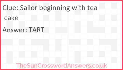 Sailor beginning with tea cake is a crossword clue for which we have 1 possible answer and we have spotted 1 times in our database. This crossword clue was last seen on 04 June 2022 in The Sun Cryptic Crossword puzzle!