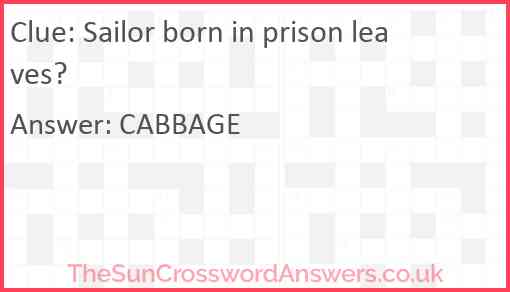 Sailor born in prison leaves? is a crossword clue for which we have 1 possible answer and we have spotted 2 times in our database. This crossword clue was last seen on 05 July 2024 in The Sun Cryptic Crossword puzzle!