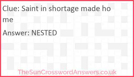 Saint in shortage made home is a crossword clue for which we have 1 possible answer and we have spotted 2 times in our database. This crossword clue was last seen on 18 March 2023 in The Sun Cryptic Crossword puzzle!