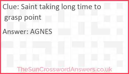 Saint taking long time to grasp point is a crossword clue for which we have 1 possible answer and we have spotted 1 times in our database. This crossword clue was last seen on 26 March 2024 in The Sun Cryptic Crossword puzzle!