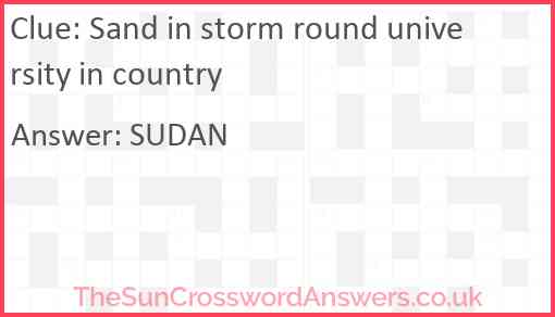 Sand in storm round university in country is a crossword clue for which we have 1 possible answer and we have spotted 1 times in our database. This crossword clue was last seen on 15 February 2021 in The Sun Cryptic Crossword puzzle!