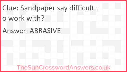 Sandpaper say difficult to work with? is a crossword clue for which we have 1 possible answer and we have spotted 3 times in our database. This crossword clue was last seen on 06 January 2025 in The Sun Cryptic Crossword puzzle!