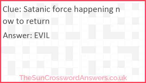 Satanic force happening now to return is a crossword clue for which we have 1 possible answer and we have spotted 1 times in our database. This crossword clue was last seen on 23 February 2021 in The Sun Cryptic Crossword puzzle!