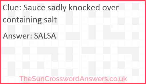 Sauce sadly knocked over containing salt is a crossword clue for which we have 1 possible answer and we have spotted 1 times in our database. This crossword clue was last seen on 26 September 2023 in The Sun Cryptic Crossword puzzle!