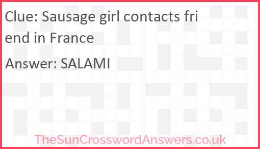 Sausage girl contacts friend in France is a crossword clue for which we have 1 possible answer and we have spotted 2 times in our database. This crossword clue was last seen on 05 November 2022 in The Sun Cryptic Crossword puzzle!