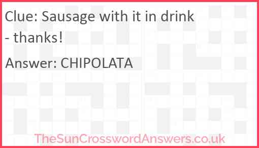 Sausage with it in drink: thanks! is a crossword clue for which we have 1 possible answer and we have spotted 2 times in our database. This crossword clue was last seen on 17 February 2023 in The Sun Cryptic Crossword puzzle!