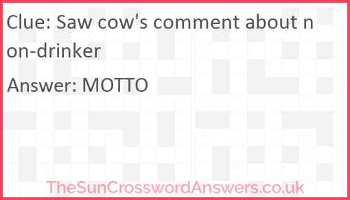 Saw cow's comment about non-drinker is a crossword clue for which we have 1 possible answer and we have spotted 1 times in our database. This crossword clue was last seen on 24 May 2020 in The Sun Cryptic Crossword puzzle!