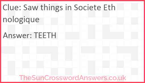 Saw things in Societe Ethnologique is a crossword clue for which we have 1 possible answer and we have spotted 1 times in our database. This crossword clue was last seen on 12 December 2024 in The Sun Cryptic Crossword puzzle!
