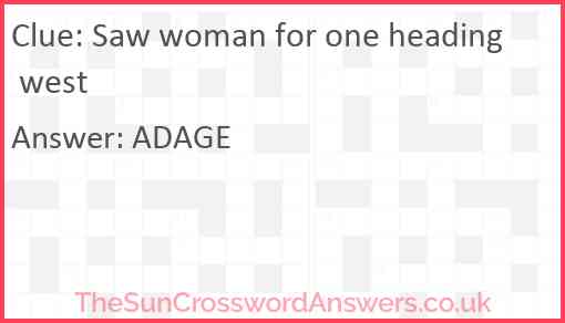 Saw woman for one heading west is a crossword clue for which we have 1 possible answer and we have spotted 1 times in our database. This crossword clue was last seen on 12 September 2024 in The Sun Cryptic Crossword puzzle!