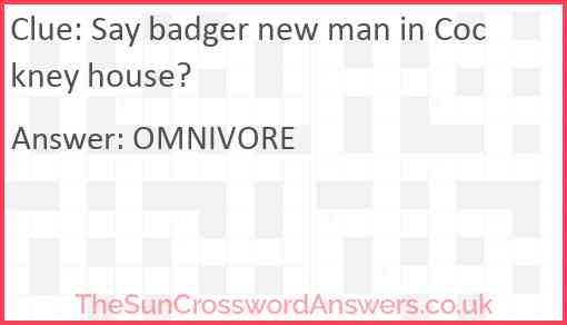 Say badger new man in Cockney house? is a crossword clue for which we have 1 possible answer and we have spotted 1 times in our database. This crossword clue was last seen on 14 June 2022 in The Sun Cryptic Crossword puzzle!