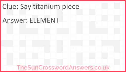Say titanium piece is a crossword clue for which we have 1 possible answer and we have spotted 4 times in our database. This crossword clue was last seen on 20 July 2025 in The Sun Cryptic Crossword puzzle!