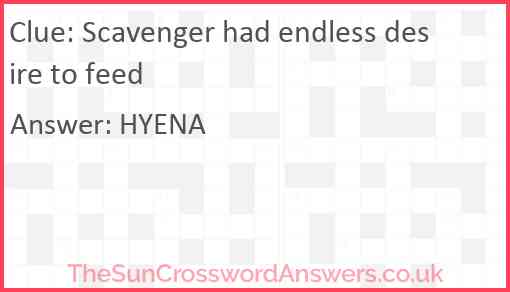 Scavenger had endless desire to feed is a crossword clue for which we have 1 possible answer and we have spotted 1 times in our database. This crossword clue was last seen on 22 March 2025 in The Sun Cryptic Crossword puzzle!