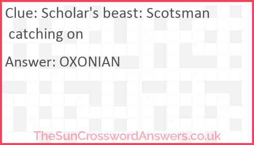 Scholar's beast: Scotsman catching on is a crossword clue for which we have 1 possible answer and we have spotted 1 times in our database. This crossword clue was last seen on 24 February 2022 in The Sun Cryptic Crossword puzzle!