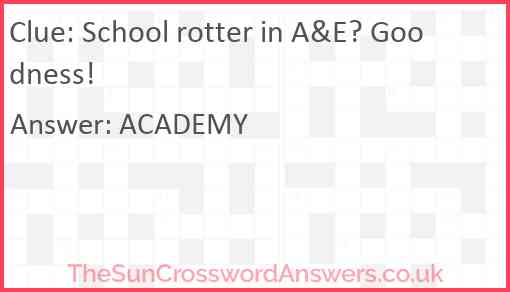 School rotter in A&E? Goodness! is a crossword clue for which we have 1 possible answer and we have spotted 3 times in our database. This crossword clue was last seen on 25 March 2023 in The Sun Cryptic Crossword puzzle!