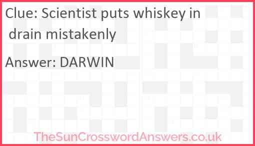 Scientist puts whiskey in drain mistakenly is a crossword clue for which we have 1 possible answer and we have spotted 2 times in our database. This crossword clue was last seen on 09 November 2023 in The Sun Cryptic Crossword puzzle!