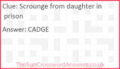 Scrounge from daughter in prison is a crossword clue for which we have 1 possible answer and we have spotted 2 times in our database. This crossword clue was last seen on 07 December 2023 in The Sun Cryptic Crossword puzzle!