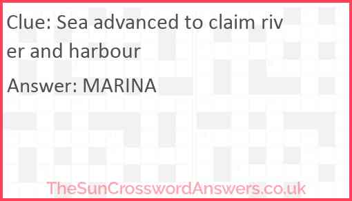 Sea advanced to claim river and harbour is a crossword clue for which we have 1 possible answer and we have spotted 2 times in our database. This crossword clue was last seen on 17 May 2022 in The Sun Cryptic Crossword puzzle!