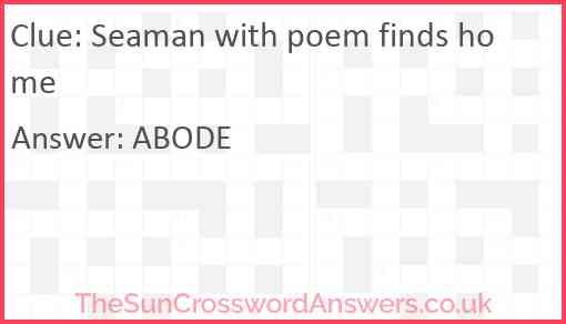 Seaman with poem finds home is a crossword clue for which we have 1 possible answer and we have spotted 3 times in our database. This crossword clue was last seen on 02 August 2022 in The Sun Cryptic Crossword puzzle!