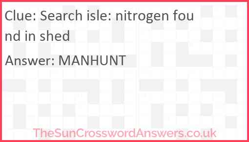 Search isle: nitrogen found in shed is a crossword clue for which we have 1 possible answer and we have spotted 2 times in our database. This crossword clue was last seen on 26 October 2023 in The Sun Cryptic Crossword puzzle!