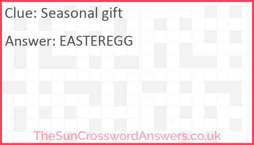 Seasonal gift is a crossword clue for which we have 1 possible answer and we have spotted 1 times in our database. This crossword clue was last seen on 18 December 2020 in The Sun Coffee Time Crossword puzzle!
