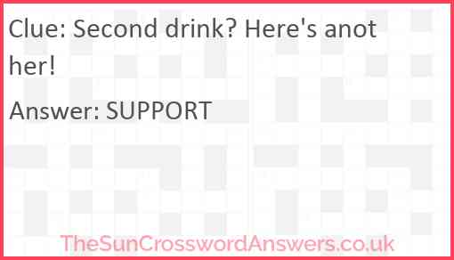 Second drink? Here's another! is a crossword clue for which we have 1 possible answer and we have spotted 1 times in our database. This crossword clue was last seen on 25 September 2023 in The Sun Cryptic Crossword puzzle!