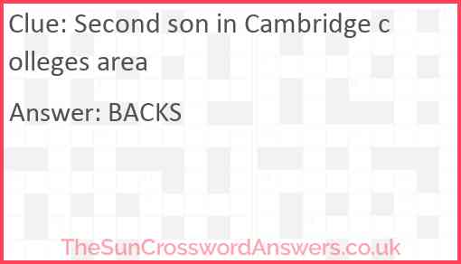 Second son in Cambridge colleges area is a crossword clue for which we have 1 possible answer and we have spotted 1 times in our database. This crossword clue was last seen on 23 September 2021 in The Sun Cryptic Crossword puzzle!