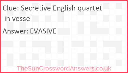 Secretive English quartet in vessel is a crossword clue for which we have 1 possible answer and we have spotted 4 times in our database. This crossword clue was last seen on 02 June 2025 in The Sun Cryptic Crossword puzzle!