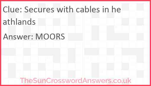 Secures with cables in heathlands is a crossword clue for which we have 1 possible answer and we have spotted 2 times in our database. This crossword clue was last seen on 16 January 2025 in The Sun Cryptic Crossword puzzle!
