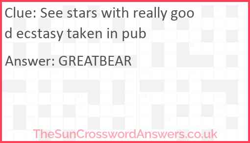 See stars with really good ecstasy taken in pub is a crossword clue for which we have 1 possible answer and we have spotted 1 times in our database. This crossword clue was last seen on 07 March 2025 in The Sun Cryptic Crossword puzzle!