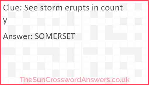See storm erupts in county is a crossword clue for which we have 1 possible answer and we have spotted 2 times in our database. This crossword clue was last seen on 27 November 2023 in The Sun Cryptic Crossword puzzle!