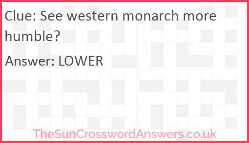 See western monarch more humble? is a crossword clue for which we have 1 possible answer and we have spotted 1 times in our database. This crossword clue was last seen on 23 April 2021 in The Sun Cryptic Crossword puzzle!