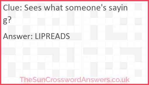 Sees what someone's saying? is a crossword clue for which we have 1 possible answer and we have spotted 1 times in our database. This crossword clue was last seen on 14 February 2021 in The Sun Cryptic Crossword puzzle!