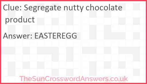 Segregate nutty chocolate product is a crossword clue for which we have 1 possible answer and we have spotted 1 times in our database. This crossword clue was last seen on 18 December 2020 in The Sun Cryptic Crossword puzzle!