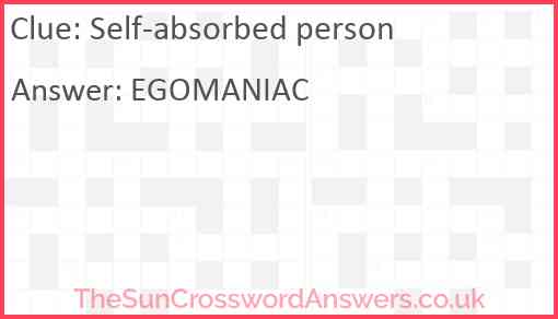 Self-absorbed person is a crossword clue for which we have 2 possible answer and we have spotted 6 times in our database. This crossword clue was last seen on 01 September 2023 in The Sun Coffee Time Crossword puzzle!