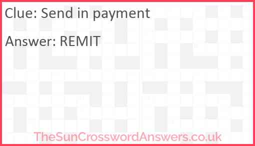Send in payment is a crossword clue for which we have 1 possible answer and we have spotted 2 times in our database. This crossword clue was last seen on 03 July 2023 in The Sun Coffee Time Crossword puzzle!