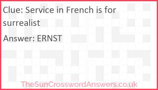Service in French is for surrealist is a crossword clue for which we have 1 possible answer and we have spotted 1 times in our database. This crossword clue was last seen on 06 May 2021 in The Sun Cryptic Crossword puzzle!