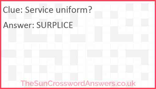 Service uniform? is a crossword clue for which we have 1 possible answer and we have spotted 1 times in our database. This crossword clue was last seen on 03 March 2025 in The Sun Cryptic Crossword puzzle!