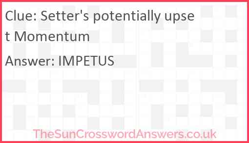 Setter's potentially upset Momentum is a crossword clue for which we have 1 possible answer and we have spotted 2 times in our database. This crossword clue was last seen on 06 September 2022 in The Sun Cryptic Crossword puzzle!