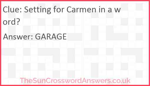 Setting for Carmen in a word? is a crossword clue for which we have 1 possible answer and we have spotted 2 times in our database. This crossword clue was last seen on 17 July 2024 in The Sun Cryptic Crossword puzzle!