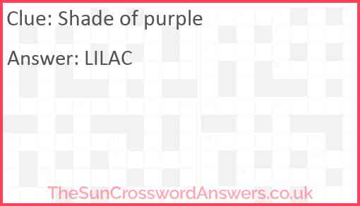Shade of purple is a crossword clue for which we have 1 possible answer and we have spotted 1 times in our database. This crossword clue was last seen on 17 March 2020 in The Sun Coffee Time Crossword puzzle!